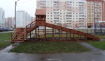Скат, лестница с перилами, домик под деревянной крышей, стол, лавочки